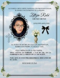 Oaxaca, Oax.- Tristeza, enojo y consternación es lo que ha generado el feminicidio de la maestra de primaria Zeltzin Rubí Ortiz de 27 años de edad y originaria de San Pedro Tlaxiaco, quién fue localizada sin vida al interior de su domicilio en la comunidad de Santa María Lachichina, perteneciente al municipio de San Juan Yaee en la Sierra Juárez de Oaxaca.