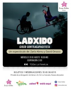 Si están por la Ciudad de Oaxaca este miércoles 20 de agosto, vayan Casa Ceiba (Privada de prolongación de Venus L-8, Col. La Cascada, Oaxaca de Juárez) a ver Ladxido, circo contracapacitista una activación escénica en la que podrán reflexionar junto a David y Zaría temas tan importantes como el cuidado, la enfermedad y la discapacidad y también ser partícipes de un espectáculo que cuenta con todo en el sentido artístico.