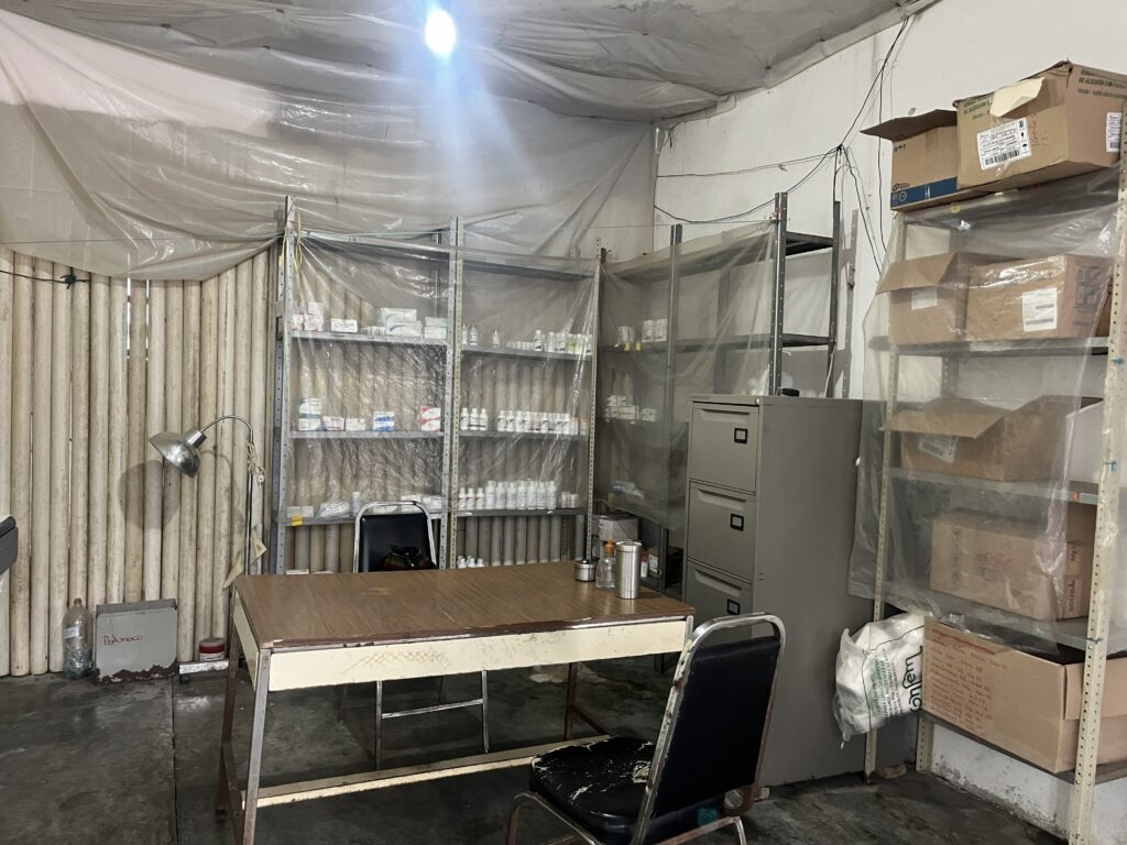 Consultorio médico del campamento visiblemente deteriorado / Consultorio médico, área de consultas y medicamentos. Fotos: Ximena Avendaño