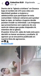 “Las imágenes que presentamos son capturas de una serie de videos que grabo Alejandro M. miembro de la iglesia. El pastor Arturo M. sabe de todo esto pero decidió no tomar acciones y ocultarlo”, dijo Andy Torres.