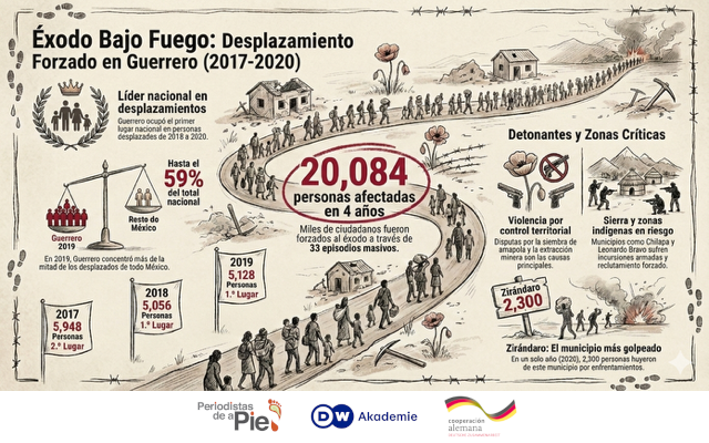 Las situaciones o hechos de violencia criminal saltan entre las causas fundamentales del desplazamiento en el país, lo que, a su vez, ha posicionado a Guerrero en los primeros sitios nacionales en personas desplazadas entre 2017 y 2020, de acuerdo con los informes de la CMDPDH, organismo que estudia el desplazamiento desde 2007. Solo en 2017 la entidad estuvo en segundo sitio, en el resto coronó.