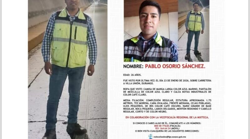 Oaxaca, Oax.- Tras la localización sin vida de cinco mineros desaparecidos el 23 de enero en Concordia, Sinaloa, es decir el mismo día, la misma hora y el mismo lugar que Pablo Osorio; su familia y abogado exigieron a la Fiscalía General de la República (FGR) información respecto al paradero del joven ingeniero originario de Tlaxiaco, Oaxaca.