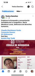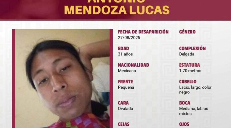 La Comisión Estatal de Búsqueda de Oaxaca informó que la defensora “María”, cómo ella se nombra desapareció este 27 de octubre, cuando vestía una blusa color verde, pantalón de mezclilla color negro, calza tenis negros y porta gorra roja.