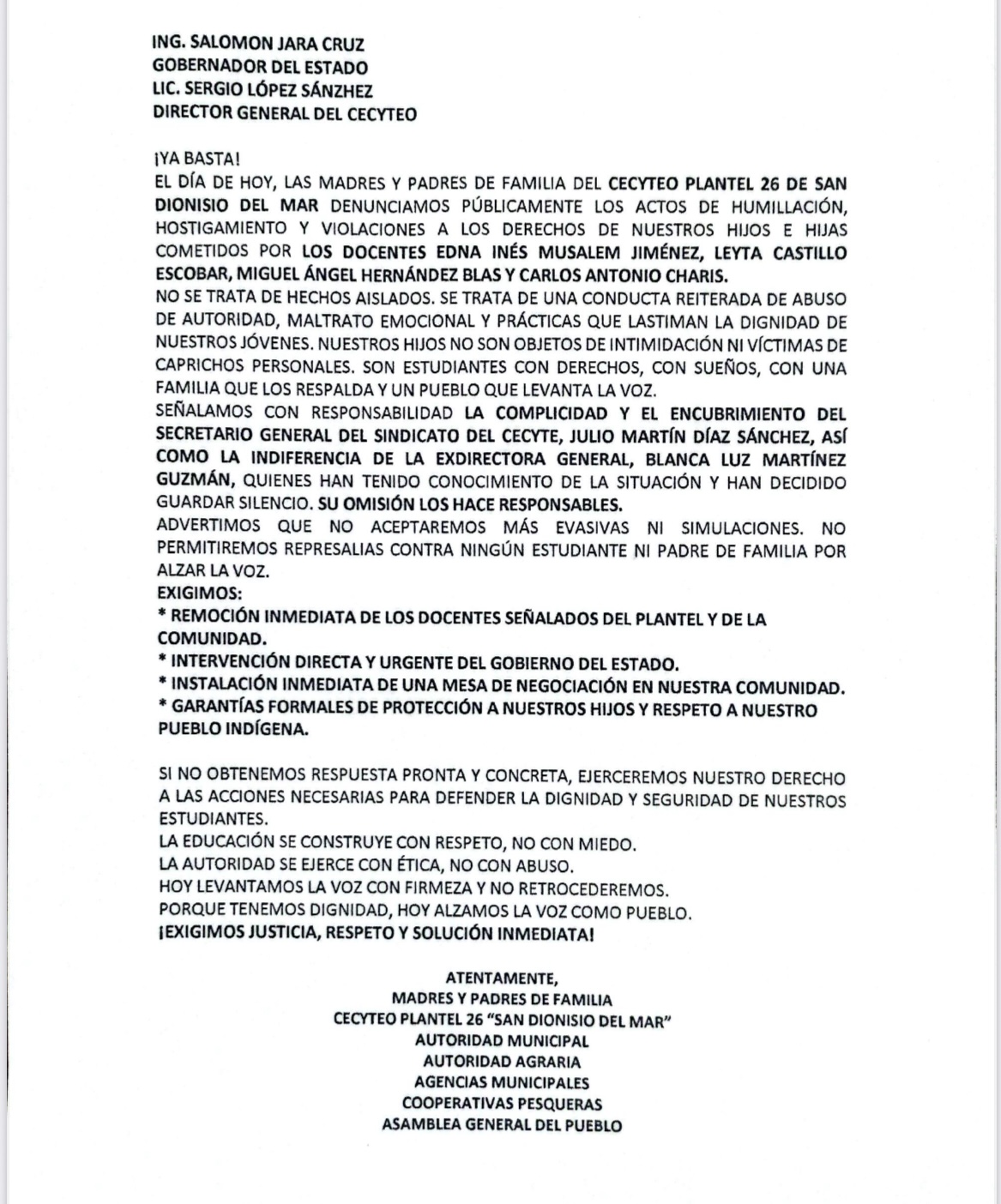 “Hemos ido ante la Fiscalía y derechos humanos de Oaxaca para denunciar estos actos de manipulación, violencia, discriminación, no vamos a tolerar a estos maestros, exigimos a las autoridades que se vayan, que los cambien de plantel y que nos regresen la paz a San Dionisio del Mar, queremos que nuestras hijas e hijos tengan clases presenciales, que todo vuelva a la normalidad”, indicó.