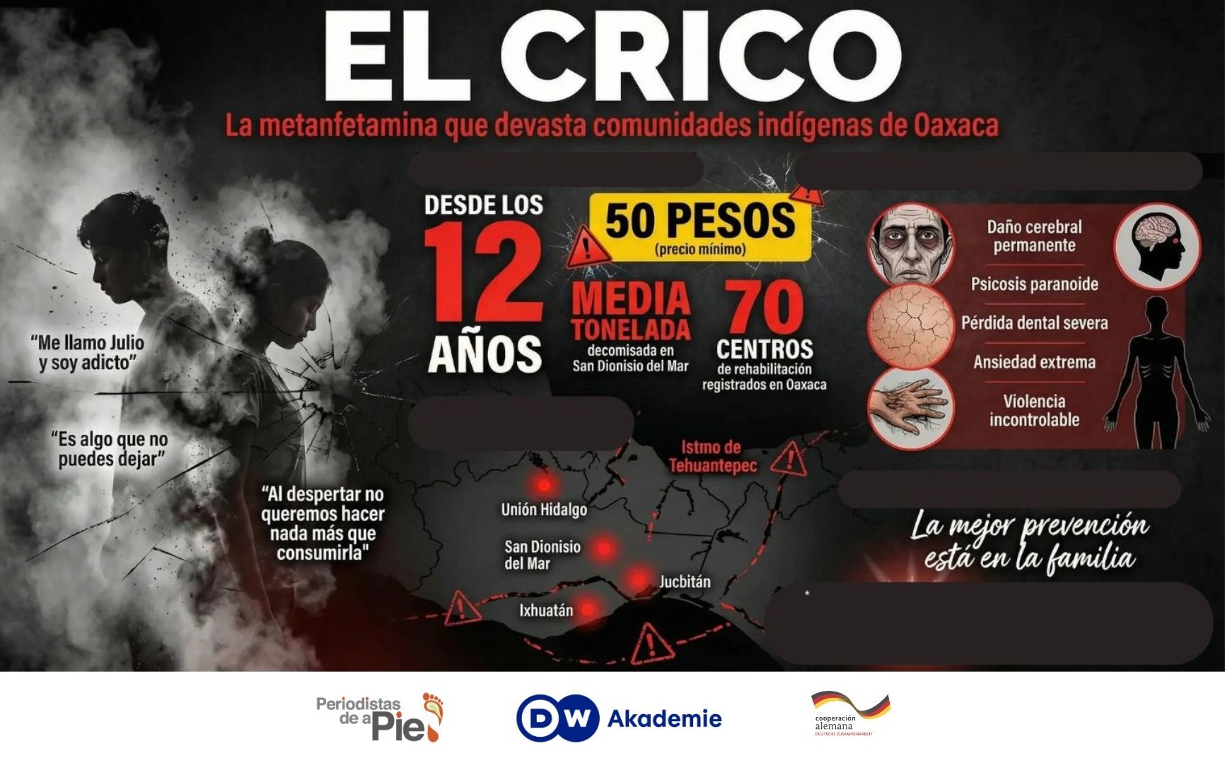 “Me llamo Julio y soy adicto”. Así comienza esta historia de cinco jóvenes indígenas que habitan en el Istmo de Tehuantepec, en el estado sureño de Oaxaca. Tres de ellos cuentan cómo el “crico o la piedra” -como llaman “al cristal”- se ha convertido en una droga altamente adictiva y su distribución parece no tener fin, porque se ha expandido hasta en las comunidades más remotas como si fuera una espuma imparable.