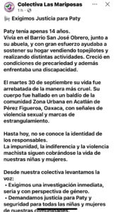 Oaxaca, Oax.- Paty tenía 14 años de edad y fue localizada sin vida, y con signos de violencia sexual y tortura el pasado 30 de septiembre. A 2 días de este feminicidio, integrantes de la colectiva oaxaqueña “Las Mariposas”, exigieron justicia.