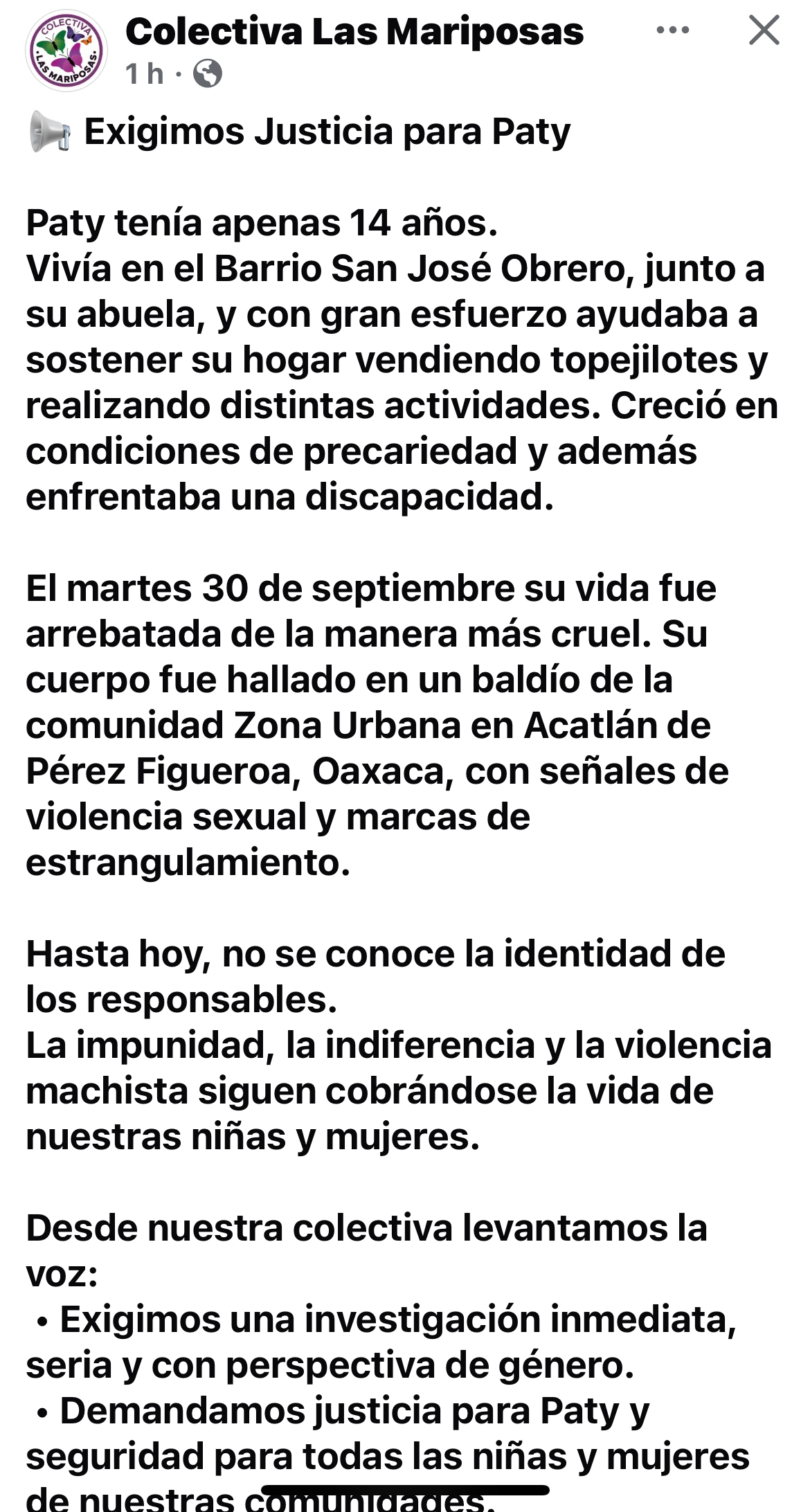 Recalcaron que Paty tenía sueños, futuro y un derecho a vivir. “Desde nuestra colectiva levantamos la voz y exigimos una investigación inmediata, seria y con perspectiva de género. Asimismo, demandamos justicia para Paty y seguridad para todas las niñas y mujeres de nuestras comunidades, y no permitiremos que su memoria sea borrada ni silenciada”, señalaron.