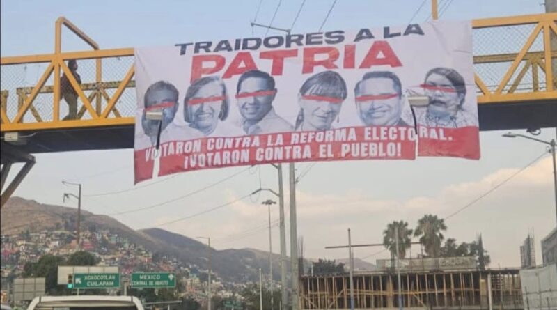 Oaxaca, Oax.- En al menos ocho puentes peatonales de la capital de Oaxaca exhibieron a través de lonas a las y los diputados que votaron contra la reforma electoral, iniciativa de la presidenta, Claudia Sheinbaum Pardo que no se aprobó ayer en el pleno de la cámara alta de San Lázaro.