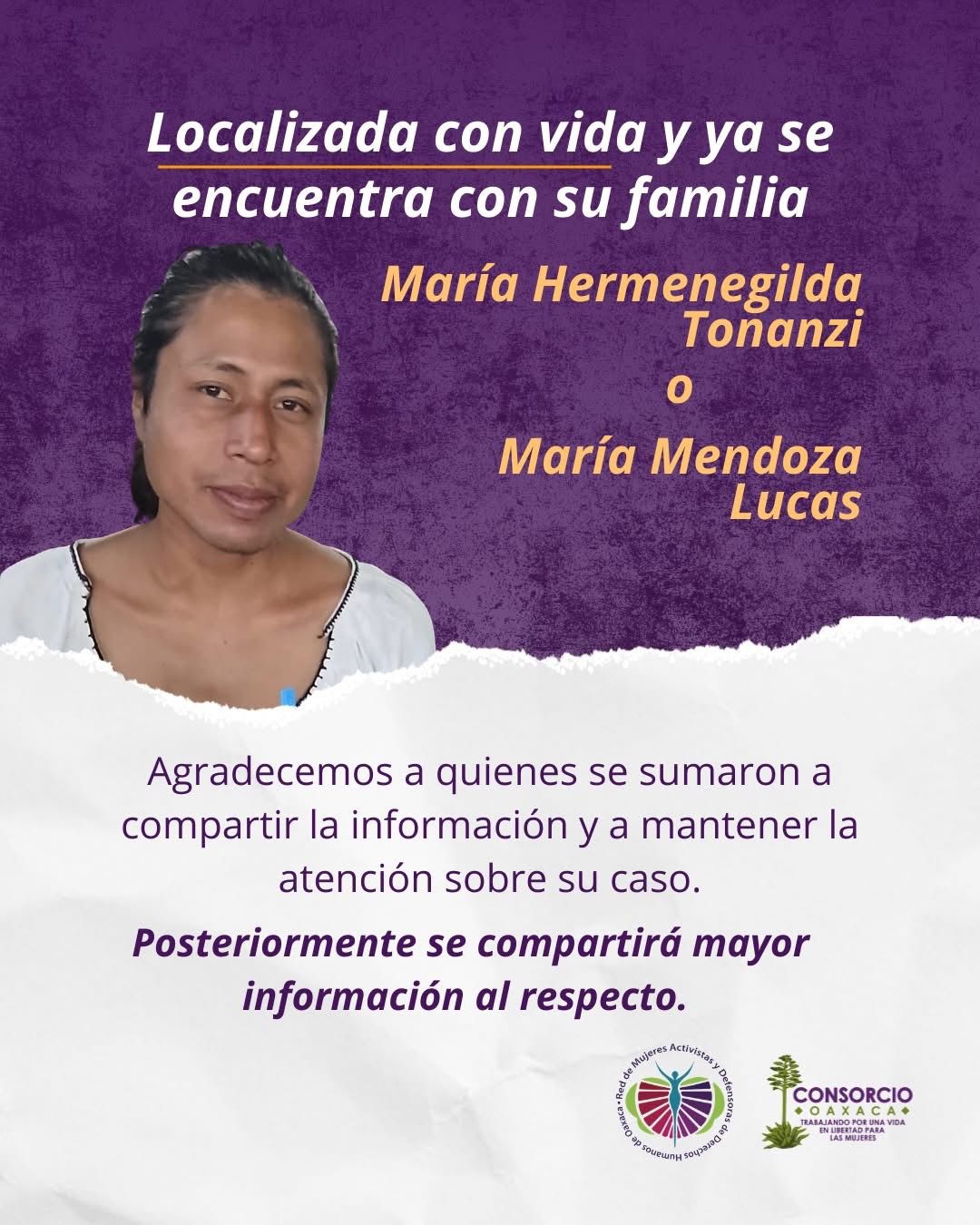 “Nos alegra enormemente informar que María Mendoza Lucas, también conocida como María Hermenegilda Tonanzi, ha sido localizada con vida y ya se encuentra con su familia”, anunció en redes sociales.