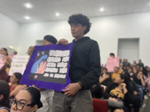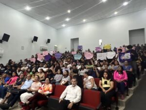 Minutos antes de que Binnizá tomara la palabra, estudiantes, mujeres y hombres se levantaron de sus asientos y le demostraron con mensajes escritos en cartulina su admiración y apoyo.