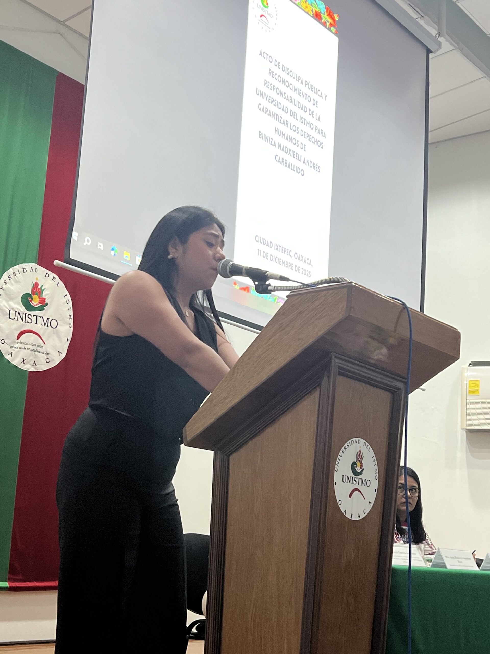Ixtepec, Oax.- Seis años después, la Universidad del Istmo -campus Ixtepec- a través del encargado de la rectoría, Edwin Román Hernández otorgó disculpas públicas con base al marco jurídico y de derechos humanos a la hoy licenciada en derecho y exestudiante de esta institución, Biniza Nadxieeli Andrés Carballido, quien vivió violencia sexual en sus aulas.