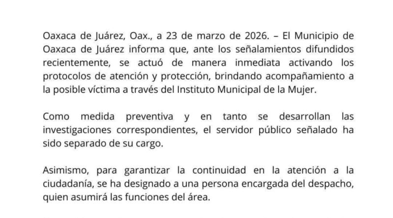 Separan de cargo a funcionario de Oaxaca de Juárez por intento de violación